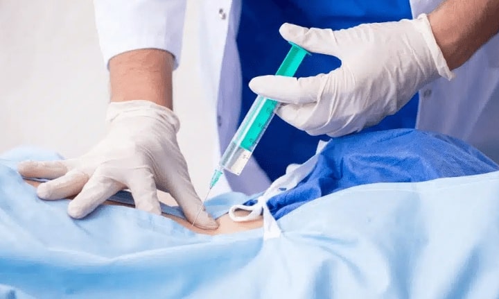 2.  **بیحسی موضعی:** یک بیحسی موضعی به پوست تزریق میشود تا ناحیه بیحس شود و بیمار در طول تزریق اصلی درد کمتری احساس کند.