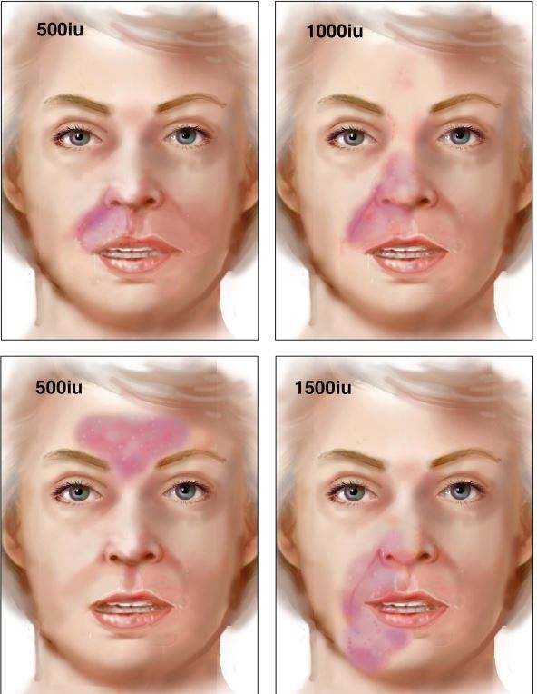 * **ناحیه گلابلا (بین ابروها و بالای بینی):** این ناحیه دارای عروق خونی زیادی است که مستقیماً به عروق مغز متصل هستند. تزریق نادرست در این ناحیه میتواند منجر به انسداد عروق و نابینایی شود.