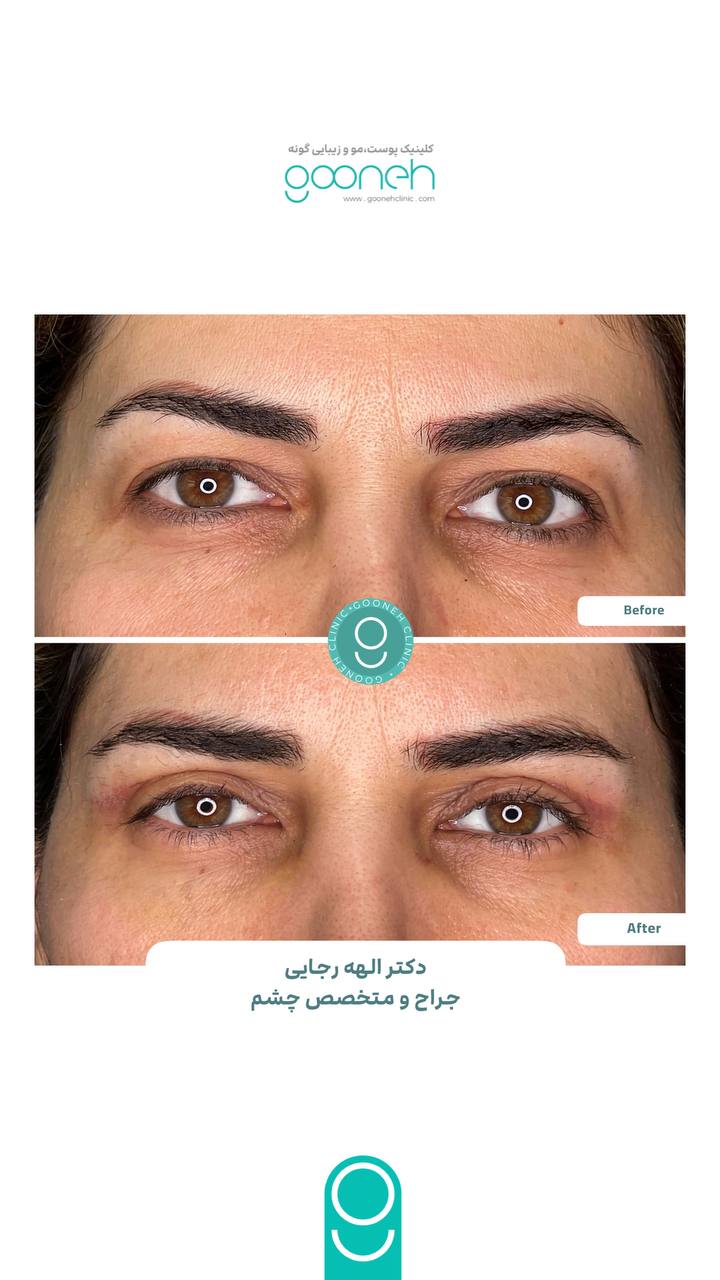 * **افتادگی پلک پایین:** شل شدن پوست و عضلات پلک پایین میتواند باعث افتادگی پلک، دیده شدن سفیدی چشم در زیر قرنیه و ایجاد ظاهری خسته و پیر شود.