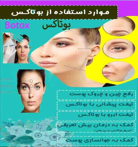 **بوتاکس:** بوتاکس عمدتاً برای کاهش چین و چروکهای ناشی از انقباض عضلات صورت استفاده میشود. این چروکها، که غالباً در نواحی پیشانی، خط اخم و اطراف چشم (خطوط پنجه کلاغی) ظاهر میشوند، با تزریق بوتاکس به عضلات مربوطه، به طور موقت فلج شده و در نتیجه، پوست صافتر به نظر میرسد. اثر بوتاکس معمولا بین 3 تا 6 ماه ماندگار است.