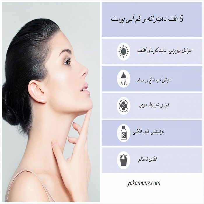 * **علل:** از دست دادن آب ناشی از عواملی مانند آب و هوا (هوای سرد و خشک)، تعریق بیش از حد، عدم مصرف کافی آب، مصرف نوشیدنیهای مدر (مانند قهوه و الکل)، استفاده از محصولات تحریککننده پوست، و قرار گرفتن در معرض نور خورشید.